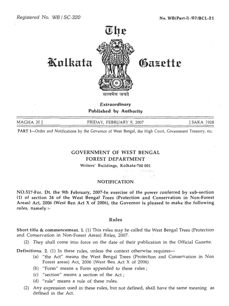 Short title & commencement. 1. (1) This rules may be called the West Bengal Trees (Protection