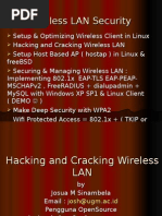 OSX native cards OSX/Darwin OSX Supports both Broadcom and Atheros Airport-Extreme cards. When using a Broadcom based card, it may be necessary to enable rfmon on the device for the first time using another program. When using an Atheros based card, 802.11a may also be supported by adding a 'sourcechannels' line to [Link]. Prism/2 Linux HostAP 0.4 [Link] HostAP drivers drive the Prism/2 chipset in access point mode, but also can drive the cards in client and monitor modes. The HostAP drivers seem to change how they go into monitor mode fairly often, but this source should manage to get them going. Intel/Centrino Linux ipw2100-0.44+ [Link] The Linux IPW2100/Centrino drivers for 802.11b cards now support rfmon, so here's support for them. They act more or less like any other wireless interface would. Intel/Centrino Linux ipw2200-1.0.4+ [Link] The Linux IPW2200/Centrino drivers for 802.11bg cards support rfmon as of 1.0.4 and firmware 2.3. Signal level reporting requires radiotap be turned on in the makefile while compiling the driver. Noise levels are not reported. Intel/Centrino Linux ipw2200-1.0.4+ [Link] The Linux IPW2200/Centrino drivers for 802.11bga cards support rfmon as of 1.0.4 and firmware 2.3. This is the same as ipw2200 but defaults to scanning the 802.11a channel range in addition to 802.11b/g. Signal level reporting requires radiotap be turned on in the makefile while compiling the driver. Noise levels are not reported. Intel/Centrino Linux ipw3945 [Link] The Linux IPW3945/Centrino drivers for Intel Core 802.11bga cards. Intel/Centrino Linux ipw2200/3945 [Link] [Link] The ipw3945 and patched ipw2200 drivers support a special mode which allows monitor-mode style sniffing while remaining associated. Channel hopping is not possible, as the card is still associated to a specific AP, but single-channel IDS and sniffing can be accomplished. See the ipw driver mailing list
