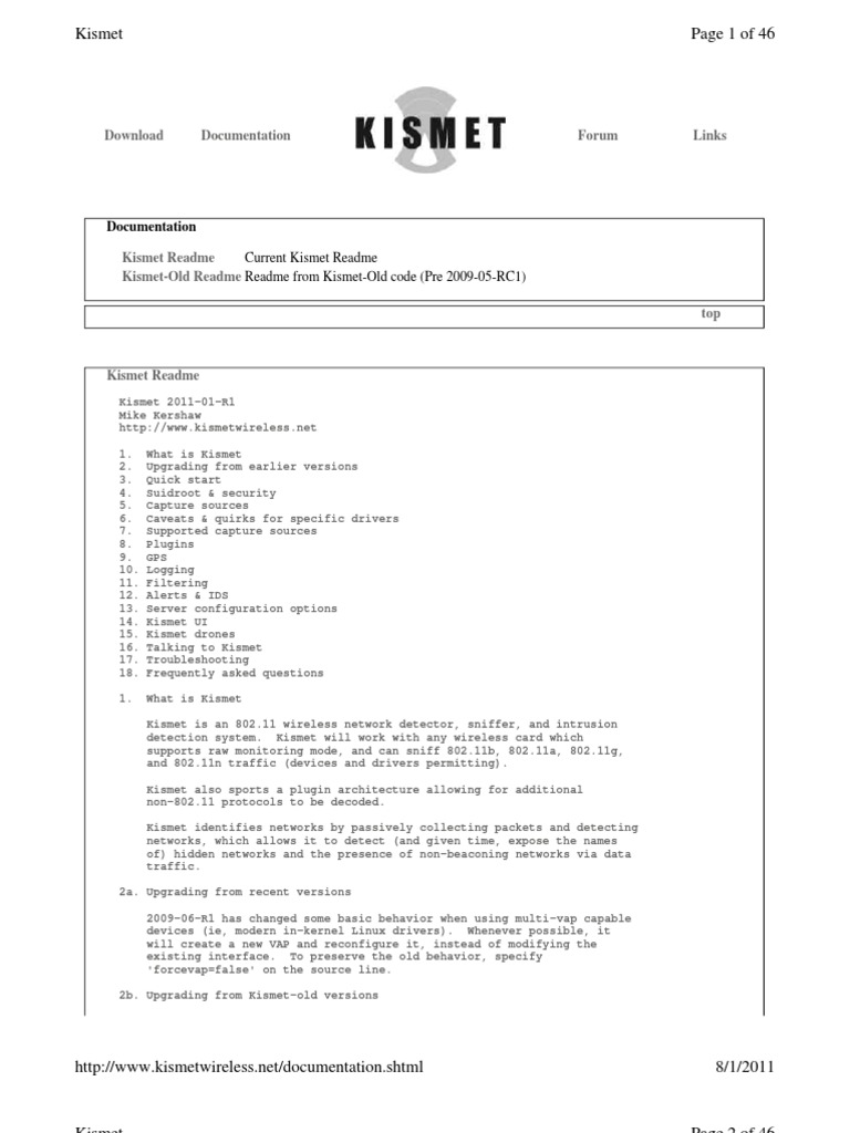 Documentation Kismet Readme Current Kismet Readme Kismet-Old Readme Readme from Kismet-Old code (Pre 2009-05-RC1) top