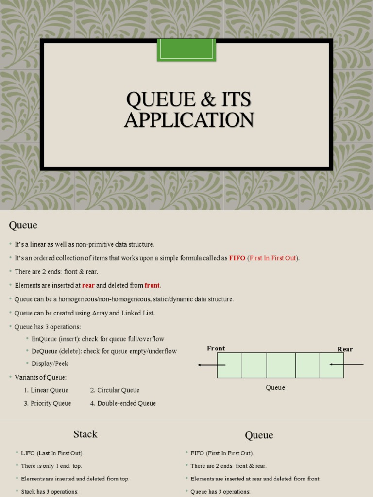 • Queue can be a homogeneous/non-homogeneous, static/dynamic data structure.