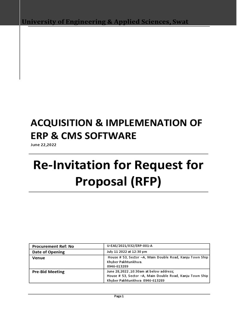 University of Engineering & Applied Sciences, Swat Request for Proposal (RFP) – Final – V1.1| June 22, 2022