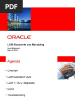 9. check LCM_FLAG of the PO Schedules and PO distribution --> if inventory item asset flag = Y, this step should not be required. SQL$Plus Login: apps/apps Update LCM_FLAG of the PO Schedules for the PO created above This is a known issue from PO team. When created, PO Schedules of LCM enabled organizations should be set to Y SELECT po_header_id FROM po_headers_all WHERE segment1 = '&PO_number'; Get the PO_HEADER_ID of entered PO UPDATE po_line_locations_all SET lcm_flag = 'Y' WHERE po_header_id = &po_header_id; UPDATE po_distributions_all SET lcm_flag = 'Y' WHERE po_header_id = &po_header_id; COMMIT; 10. Purchasing, Vision Operations (USA) /Receiving/Receipts Create a Receipt for the Standard PO created above Choose Organization LC1 Enter Purchase Order field as the PO number Click on Find button Receipt Header form window will appear. Leave it as it is so that a new receipt is created. Add to Receipt functionality is currently not supported by LCM Close the Receipt Header form window Change Quantity = 10 Save . RTI records will be created with LC_PENDING processing status so that they can be picked up by the Landed Cost Integration Manager concurrent program. receipt#1 is created