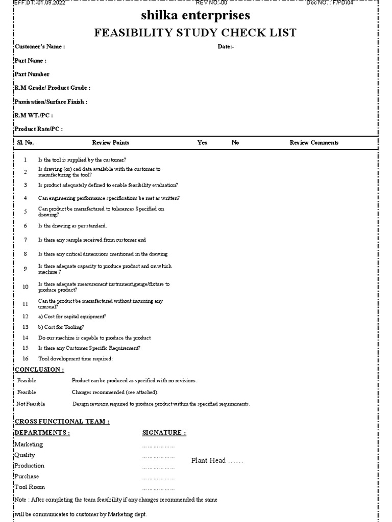 FEASIBILITY CONSIDERATION : Our Product quality planning team has considered the following questions,