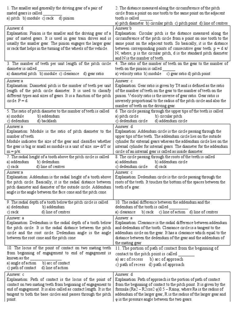 Explanation: Dedendum is the radial depth of a tooth below Explanation: Clearance is the radial difference between addendum