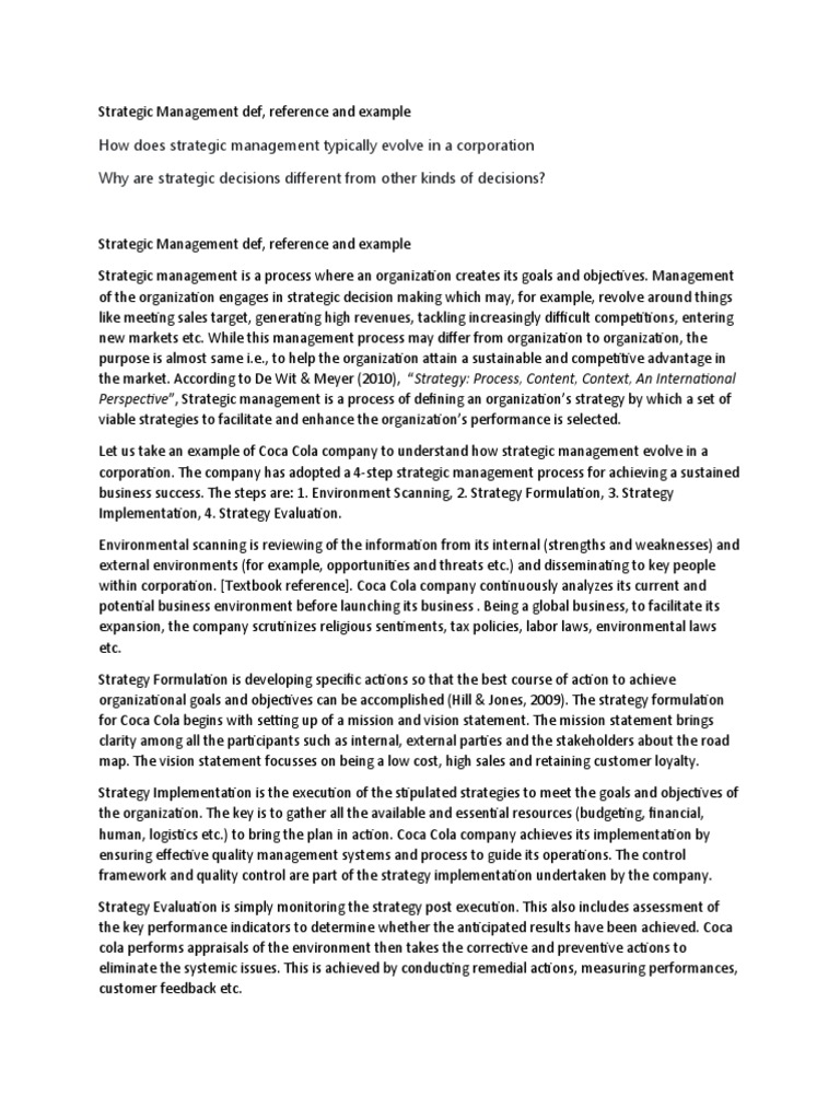 Let us take an example of Coca Cola company to understand how strategic management evolve in a