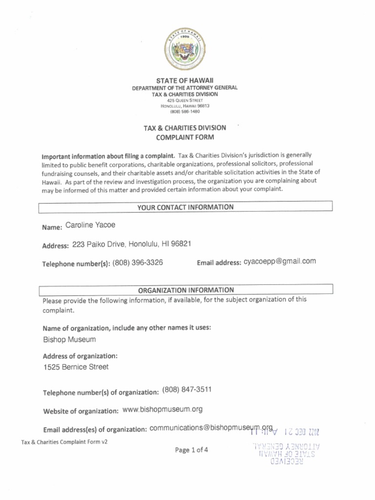 Complaint Against Bernice Pauahi Bishop Museum's Board of Directors