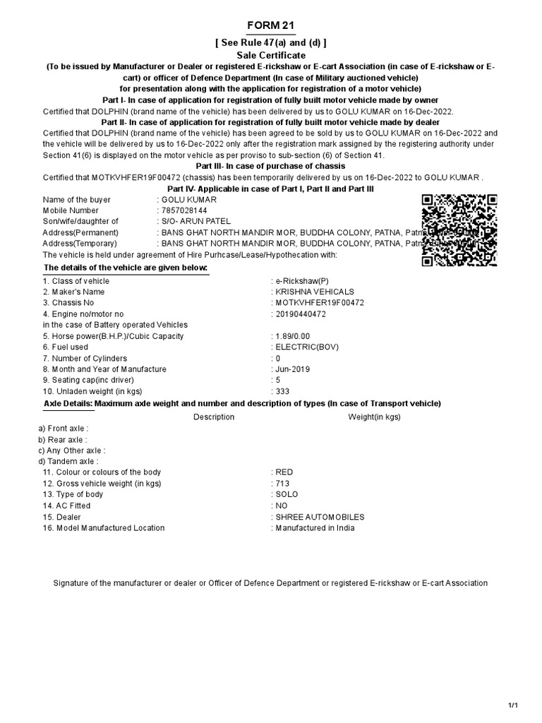 (To be issued by Manufacturer or Dealer or registered E-rickshaw or E-cart Association (in case of E-rickshaw or E-