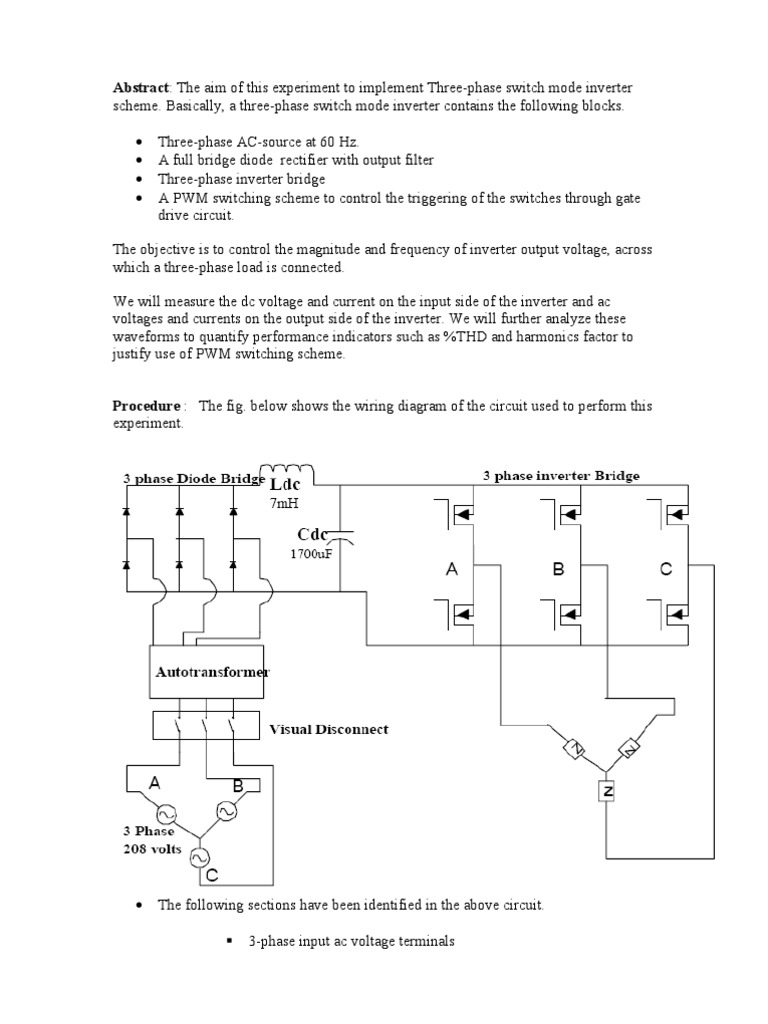 Basically, a three-phase switch mode inverter contains the following blocks. Three-phase AC-source at 60 Hz. A full bridge diode rectifier with output filter Three-phase inverter bridge A PWM switching scheme to control the triggering of the switches through gate drive circuit.