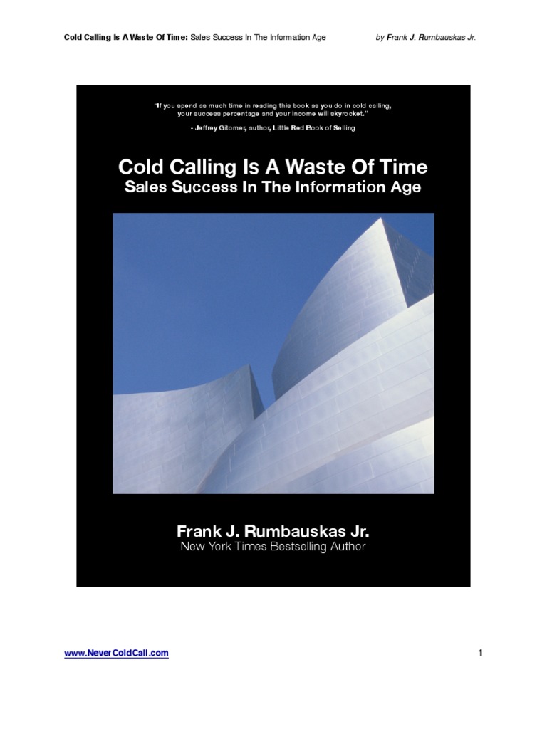 THANK YOU for reading this free preview edition of Cold Calling Is A Waste Of Time: Sales Success In The Information Age. To purchase the full breakthrough Cold Calling Is A Waste Of Time system, including the complete text of this book, two in-depth audio CDs by Frank Rumbauskas, and a host of amazing bonus products valued at over $300, please visit: www.NeverColdCall.com