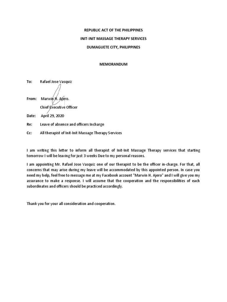 I am writing this letter to inform all therapist of Init-Init Massage Therapy services that starting