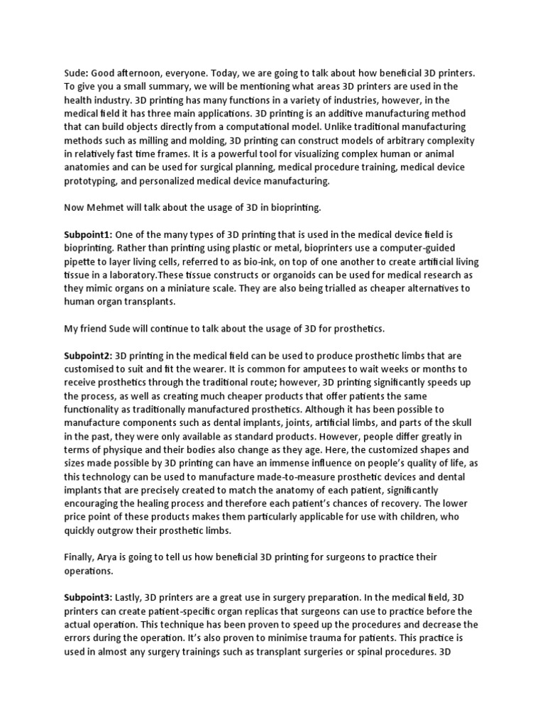 Subpoint3: Lastly, 3D printers are a great use in surgery preparation. In the medical field, 3D
