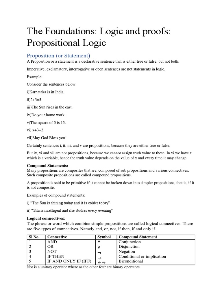 A Proposition or a statement is a declarative sentence that is either true or false, but not both.