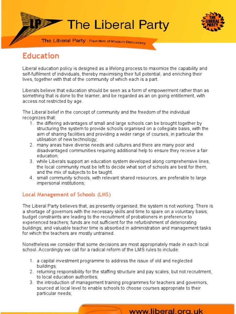 Liberal education policy is designed as a lifelong process to maximize the capability and self-fulfilment of individuals, thereby maximising their full potential, and enriching their lives, together with that of the community of which each is a part. Liberals believe that education should be seen as a form of empowerment rather than as something that is done to the learner, and be regarded as an on going entitlement, with access not restricted by age. The Liberal belief in the concept of community and the freedom of the individual recognizes that: 1. the differing advantages of small and large schools can be brought together by structuring the system to provide schools organised on a collegiate basis, with the aim of sharing facilities and providing a wider range of courses, in particular the utilisation of new technology; 2. many areas have diverse needs and cultures and there are many poor and disadvantaged communities requiring additional help to ensure they receive a fair education; 3. while Liberals support an education system developed along comprehensive lines, the local community must be left to decide what sort of schools are best for them, and the mix of subjects to be taught. 4. small community schools, with relevant shared resources, are preferable to large impersonal institutions;