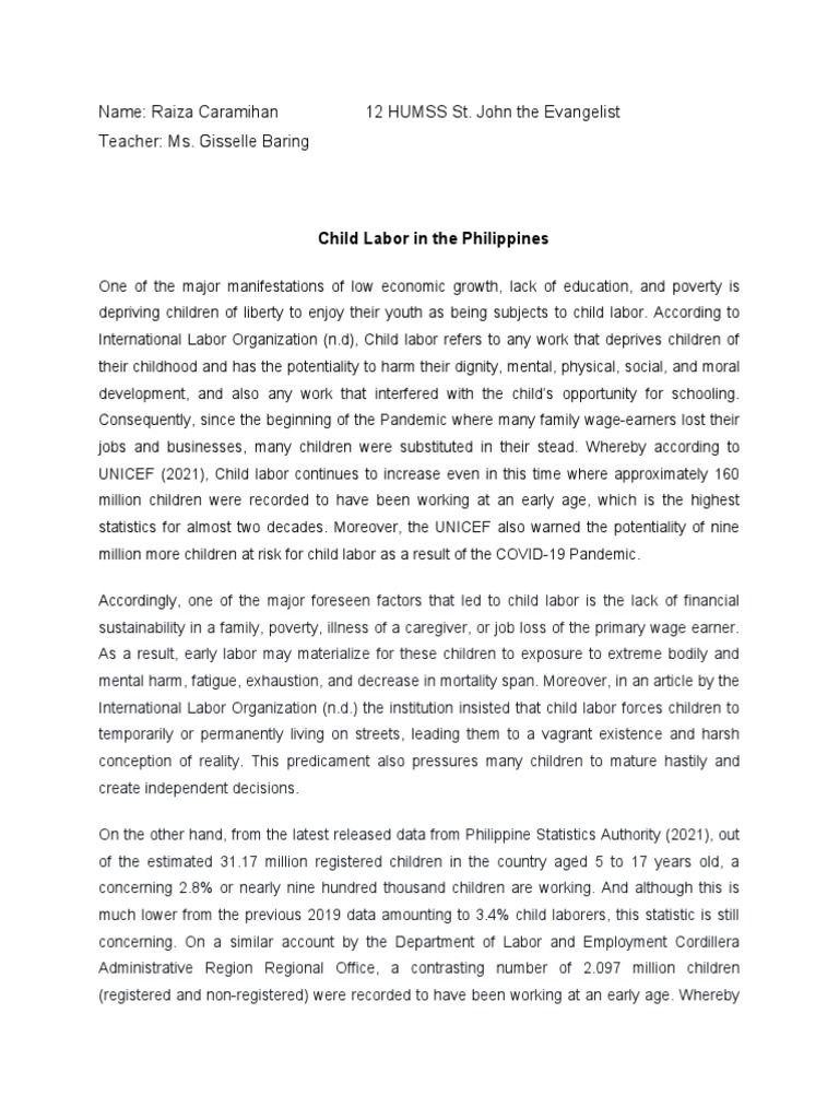 International Labor Organization (n.d), Child labor refers to any work that deprives children of