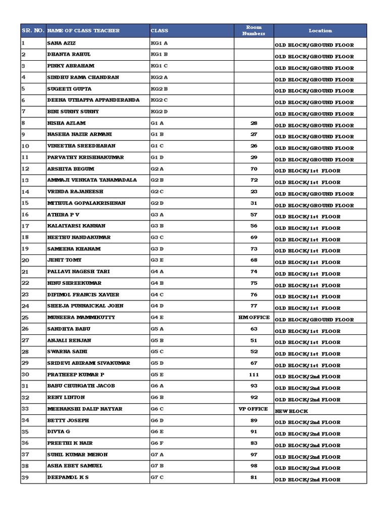 SR. NO. NAME OF CLASS TEACHER CLASS Location