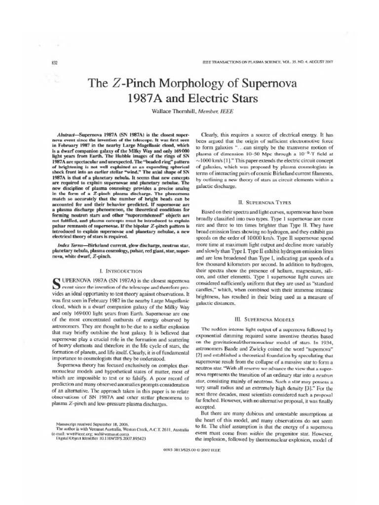 SN 1987A is the closest supernova event since the.inventioo or the telescope. The "beaded rlng"paltern of brightening is not well explained as an expaing stellar "wind" plasma cosmology provides a precise allaloa in the form of a Z-pinch plasma discbarge. The bipolar Z-pincbpattem is introduced to explain supemovae and planetary nebulae.