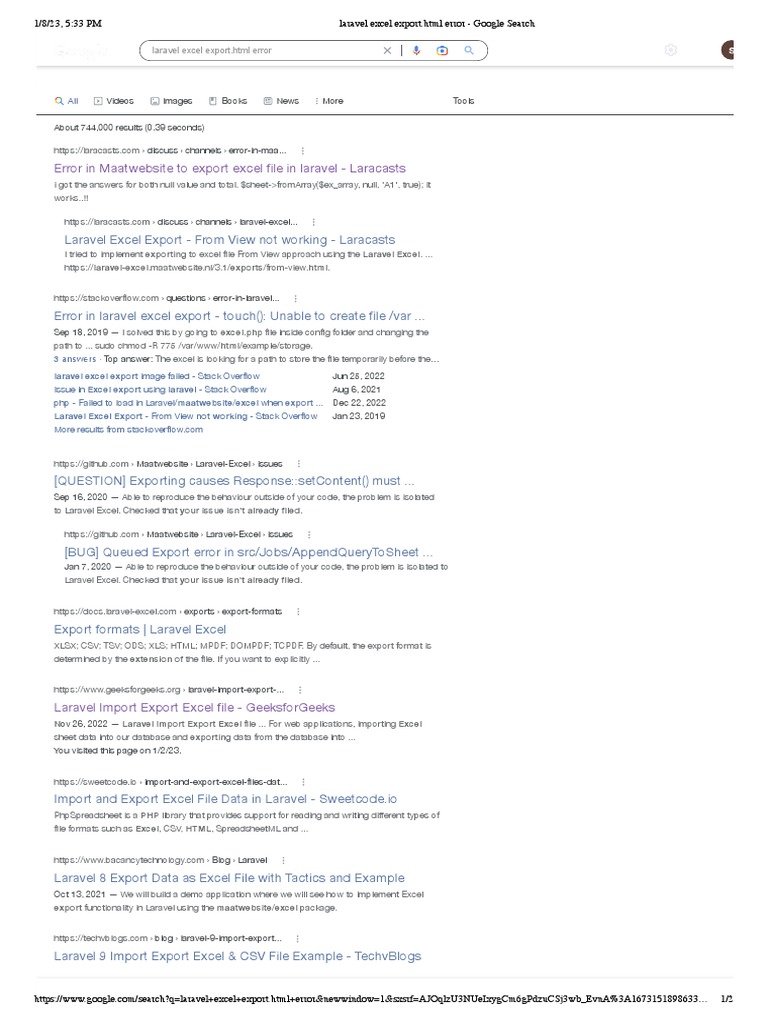 https://www.google.com/search?q=laravel+excel+export.html+error&newwindow=1&sxsrf=AJOqlzU3NUeIxygCm6gPdzuCSj3wb_EvnA%3A1673151898633… 1/2