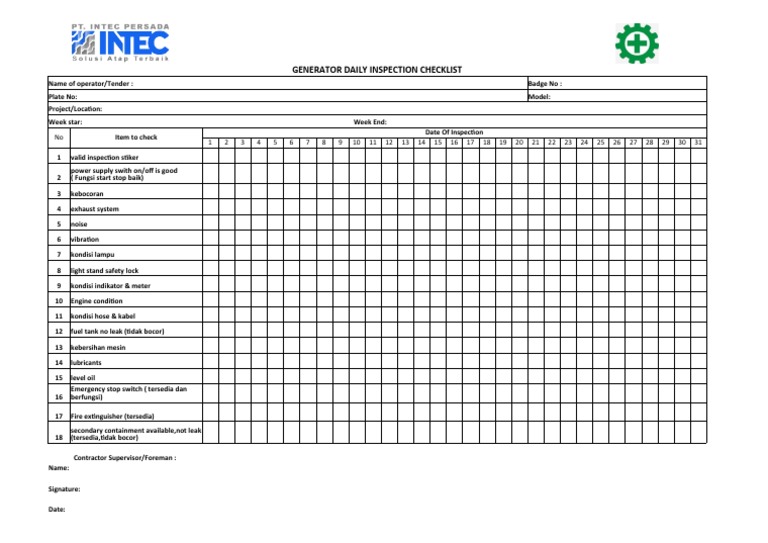 GENERATOR DAILY INSPECTION CHECKLIST