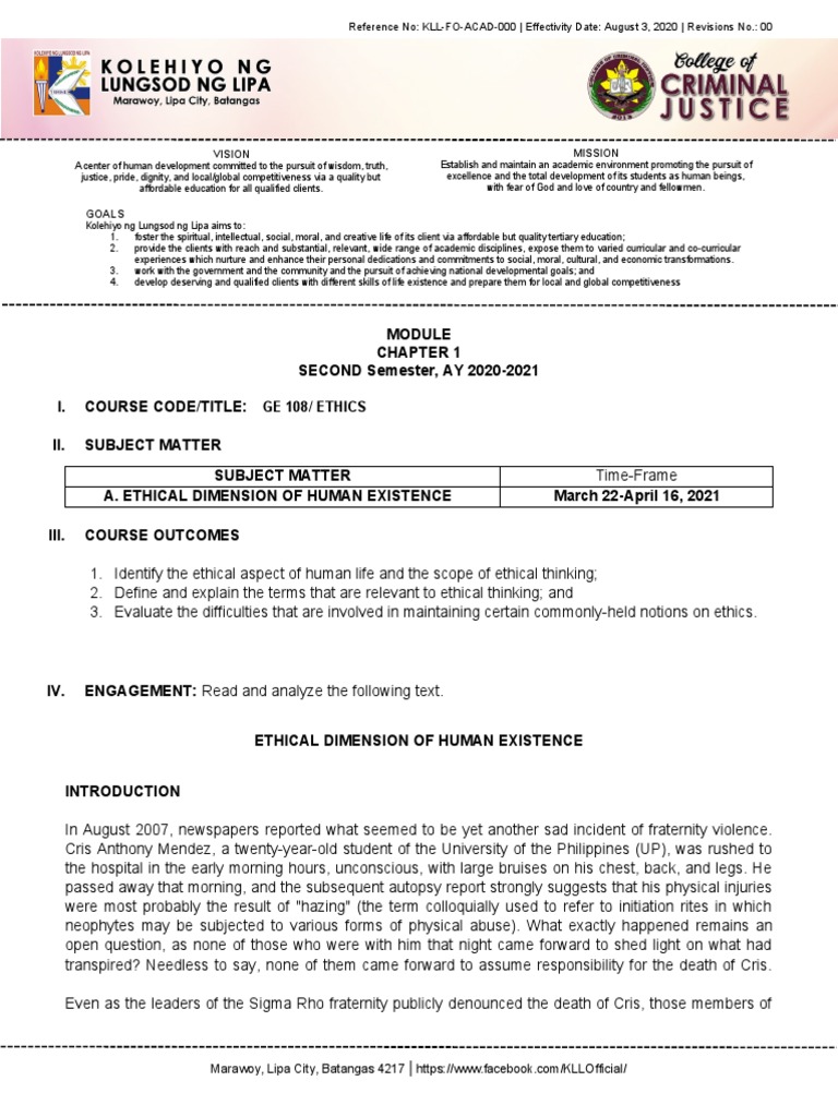 I. COURSE CODE/TITLE: GE 108/ ETHICS