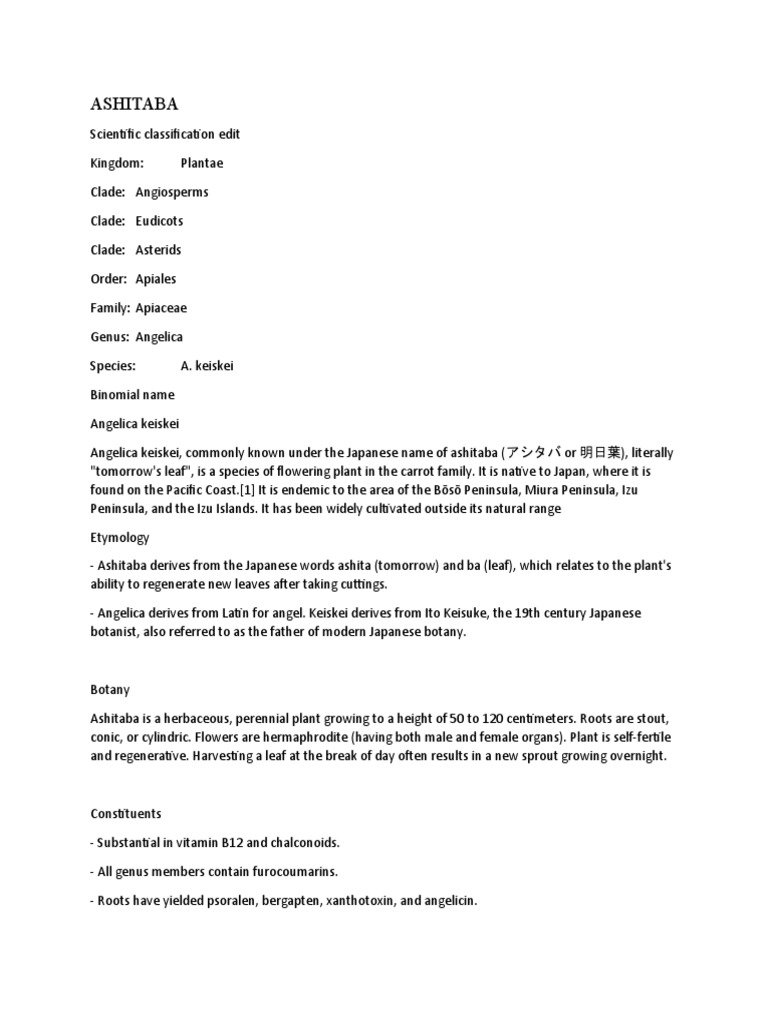 Ashitaba is a herbaceous, perennial plant growing to a height of 50 to 120 centimeters. Roots are stout,