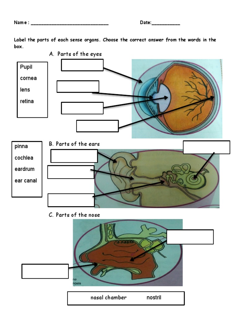 Label the parts of each sense organs. Choose the correct answer from the words in the
