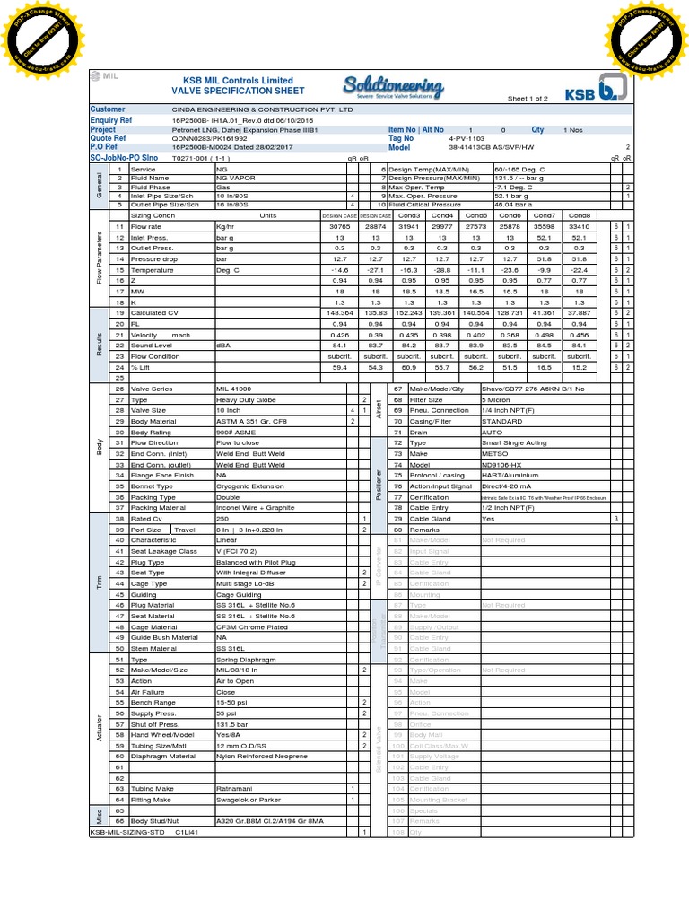 Valve Specification and Calculation Sheet