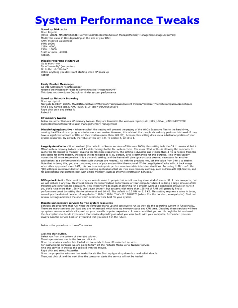 Easily Disable Messenger Go into C:Program FilesMessenger rename the Messenger folder to something like "MessengerOFF" This does not slow down Outlook or hinder system performance Speed up Network Browsing Open up regedit Navigate to HKEY_LOCAL_MACHINE//Software//Microsoft//Windows//Current Version//Explorer//RemoteComputer//NameSpace Find a key named {D6277990-4C6A-11CF-8D87-00AA0060F5BF} Right click on it and delete it Reboot ! XP memory tweaks Below are some Windows XP memory tweaks. They are located in the windows registry at: HKEY_LOCAL_MACHINESYSTEM CurrentControlSetControl Session ManagerMemory Management DisablePagingExecutive - When enabled, this setting will prevent the paging of the Win2k Executive files to the hard drive, causing the OS and most programs to be more responsive. However, it is advised that people should only perform this tweak if they have a significant amount of RAM on their system (more than 128 MB), because this setting does use a substantial portion of your system resources. By default, the value of this key is 0. To enable it, set it to 1. LargeSystemCache - When enabled (the default on Server versions of Windows 2000), this setting tells the OS to devote all but 4 MB of system memory (which is left for disk caching) to the file system cache. The main effect of this is allowing the computer to cache the OS Kernel to memory, making the OS more responsive. The setting is dynamic and if more than 4 MB is needed from the disk cache for some reason, the space will be released to it. By default, 8MB is earmarked for this purpose. This tweak usually makes the OS more responsive. It is a dynamic setting, and the kernel will give up any space deemed necessary for another application (at a performance hit when such changes are needed). As with the previous key, set the value from 0 to 1 to enable. Note that in doing this, you are consuming more of your system RAM than normal. While LargeSystemCache will cut back usage when other apps need more RAM, this process can impede performance in certain intensive situations. According to Microsoft, the "[0] setting is recommended for servers running applications that do their own memory caching, such as Microsoft SQL Server, and for applications that perform best with ample memory, such as Internet Information Services." IOPageLockLimit - This tweak is of questionable value to people that aren't running some kind of server off of their computer, but we will include it anyway. This tweak boosts the Input/Output performance of your computer when it is doing a large amount of file transfers and other similar operations. This tweak won't do much of anything for a system without a significant amount of RAM (if you don't have more than 128 MB, don't even bother), but systems with more than 128 MB of RAM will generally find a performance boost by setting this to between 8 and 16 MB. The default is 0.5 MB, or 512 KB. This setting requires a value in bytes, so multiply the desired number of megabytes * 1024 * 1024. That's X * 1048576 (where X is the number, in megabytes). Test out several settings and keep the one which seems to work best for your system Disable unnecessary services to free system resources Services are programs that run when the computer starts up and continue to run as they aid the operating system in functionality. There are many services that load and are not needed which take up memory space and CPU time. Disabling these services will free up system resources which will speed up your overall computer experience. I recommend that you sort through the list and read the descriptions to decide if you need that service depending on what you want to do with your computer. Remember, you can always turn the service back on if you find that you need it in the future. Below is the procedure to turn off a service. Click the start button. Select run from the bottom of the right column. Then type services.msc in the box and click ok. Once the services window has loaded we are ready to turn off unneeded services. For instructional purposes we are going to turn off the Portable Media Serial Number service. Find this service in the list and select it with the mouse. Right click and select Properties. Once the properties windows has loaded locate the Start up type drop down box and select disable. Then just click ok and the next time the computer starts the service will not be loaded.