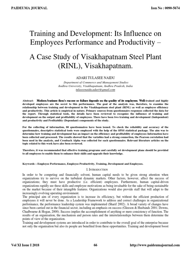 relationship between training and development in the Visakhapatnam steel plant (RINL) as well as employee efficiency