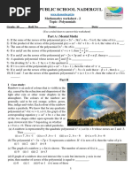 1. The document provides multiple choice questions about polynomials. 2. It tests concepts such as identifying the degree of polynomials, finding coefficients, factorizing polynomials, and evaluating polynomials for given values. 3. The questions are arranged in two sections - single questions and case-based questions that refer to short passages describing polynomial word problems.