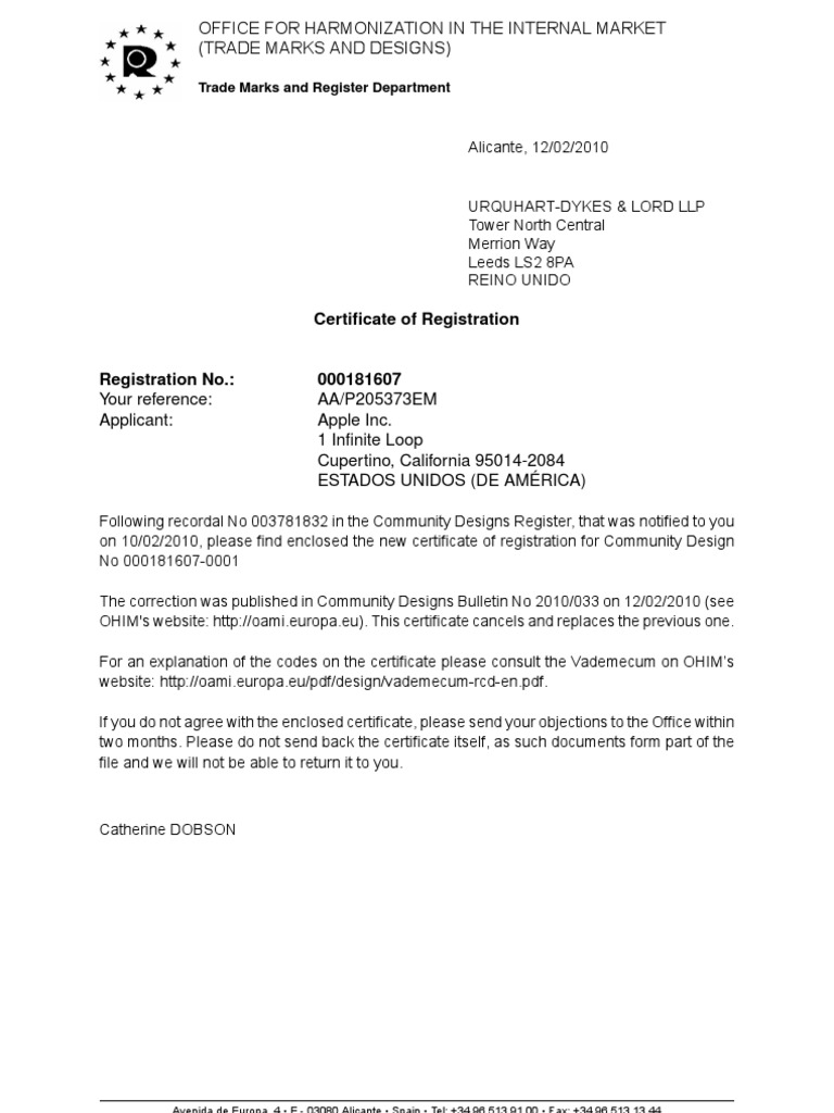 Following recordal No 003781832 in the Community Designs Register, that was notified to youon 10/02/2010, please find enclosed the new certificate of registration for Community DesignNo 000181607-0001The correction was published in Community Designs Bulletin No 2010/033 on 12/02/2010 (seeOHIM's website: http://oami.europa.eu). This certificate cancels and replaces the previous one.For an explanation of the codes on the certificate please consult the Vademecum on OHIM’swebsite: http://oami.europa.eu/pdf/design/vademecum-rcd-en.pdf.If you do not agree with the enclosed certificate, please send your objections to the Office withintwo months. Please do not send back the certificate itself, as such documents form part of thefile and we will not be able to return it to you.Catherine DOBSON