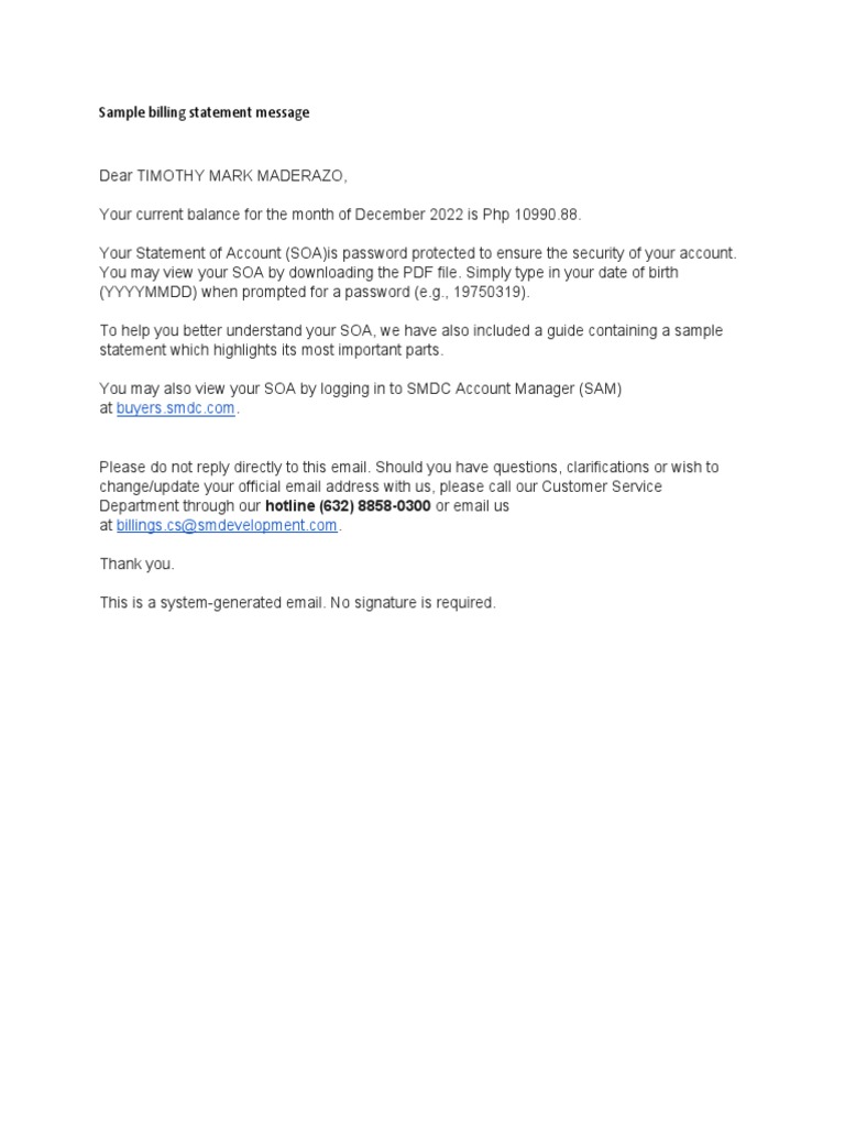 Sample billing statement message