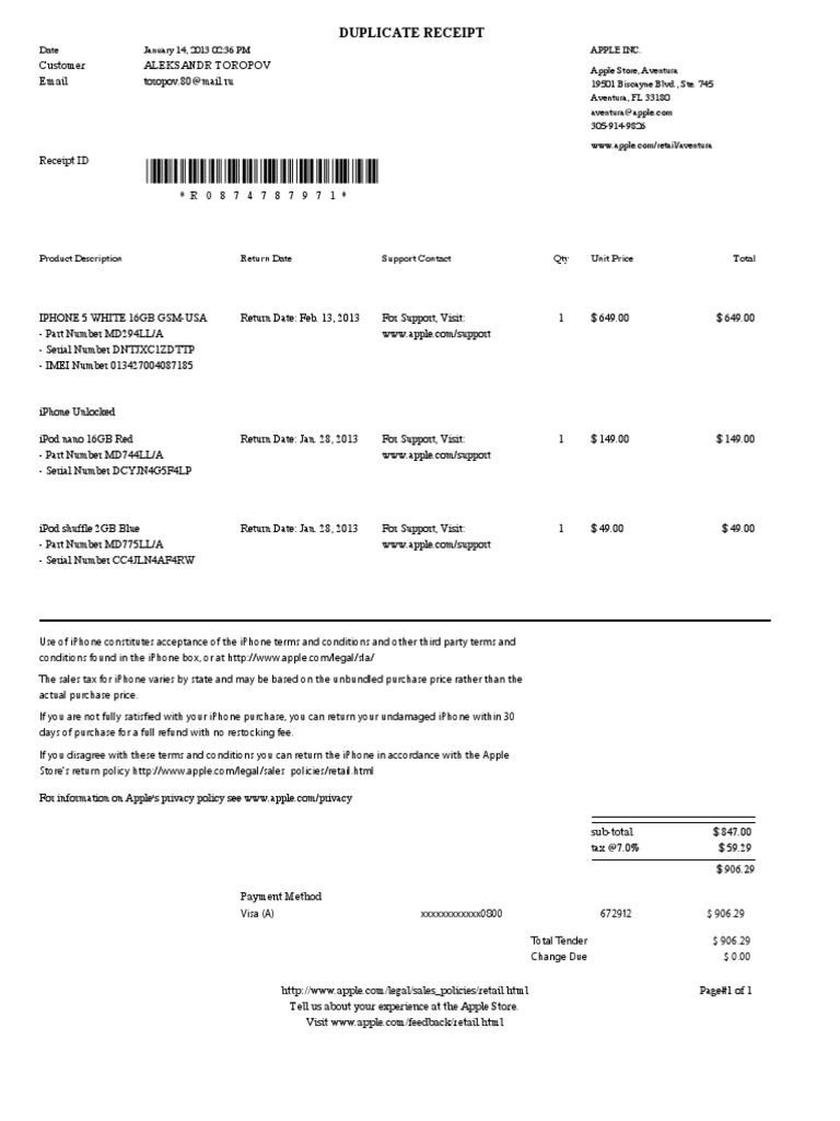 Customer ALEKSANDR TOROPOV Apple Store, Aventura