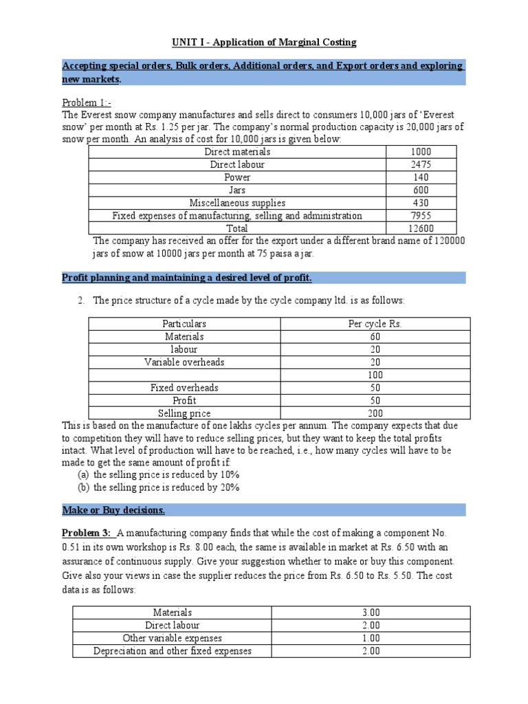 2. The price structure of a cycle made by the cycle company ltd. is as follows: