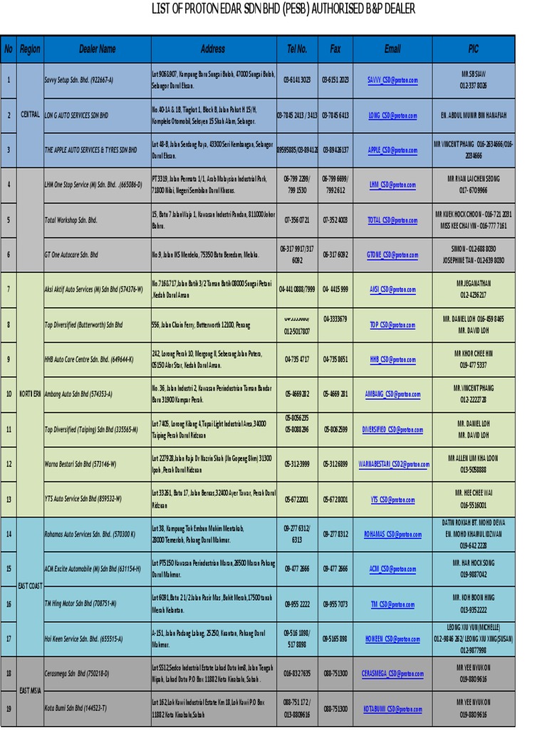 LIST OF PROTON EDAR SDN BHD (PESB) AUTHORISED B&P DEALER