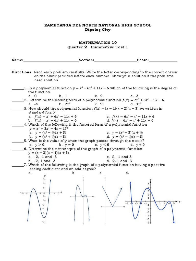 1. In a polynomial function 𝑦 = 𝑥3 − 6𝑥2 + 11𝑥 − 6, which of the following is the degree of