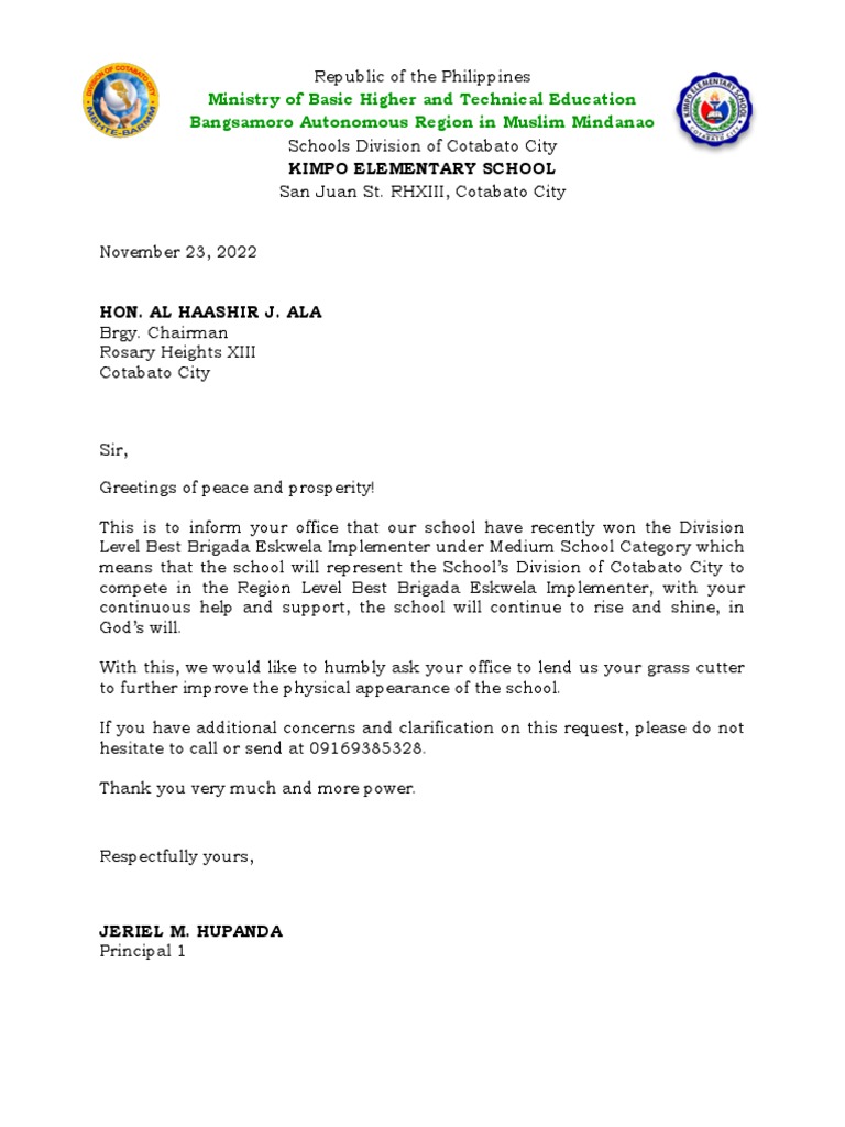 With this, we would like to humbly ask your office to lend us your grass cutter