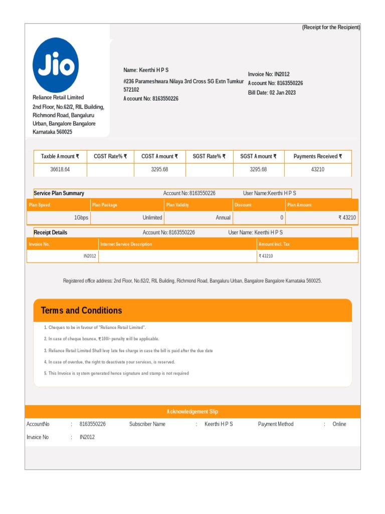 AccountNo : 8163550226 Subscriber Name : Keerthi H P S Payment Method : Online