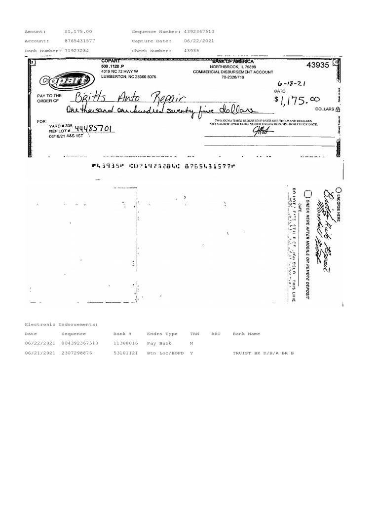 This document is a bank statement showing a payment of $1,175 made on June 22, 2021 to account number 8765431577 with a sequence number of 4392367513 from bank number 71923284. The payment was electronically endorsed by the paying bank on June 22 and the returning bank on June 21.