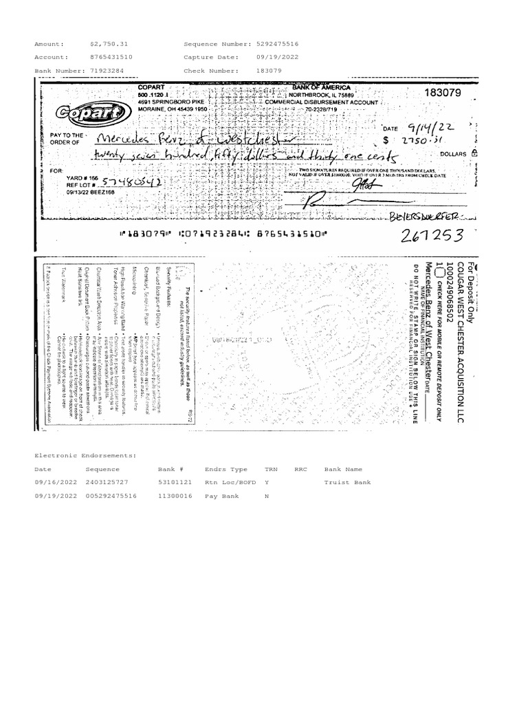 A bank statement shows a payment of $2,750.31 was captured on September 19th, 2022 with a sequence number of 5292475516 to account number 8765431510. The payment was electronically endorsed and returned by Truist Bank on September 16th before being paid by the pay bank on September 19th.