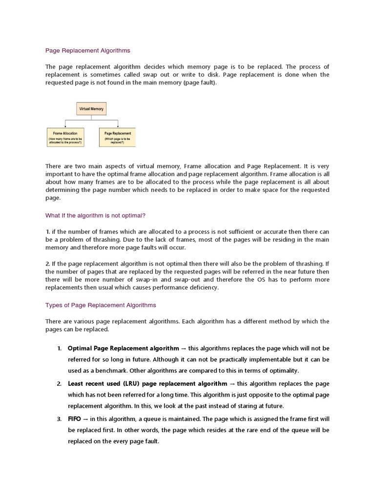 There are various page replacement algorithms. Each algorithm has a different method by which the