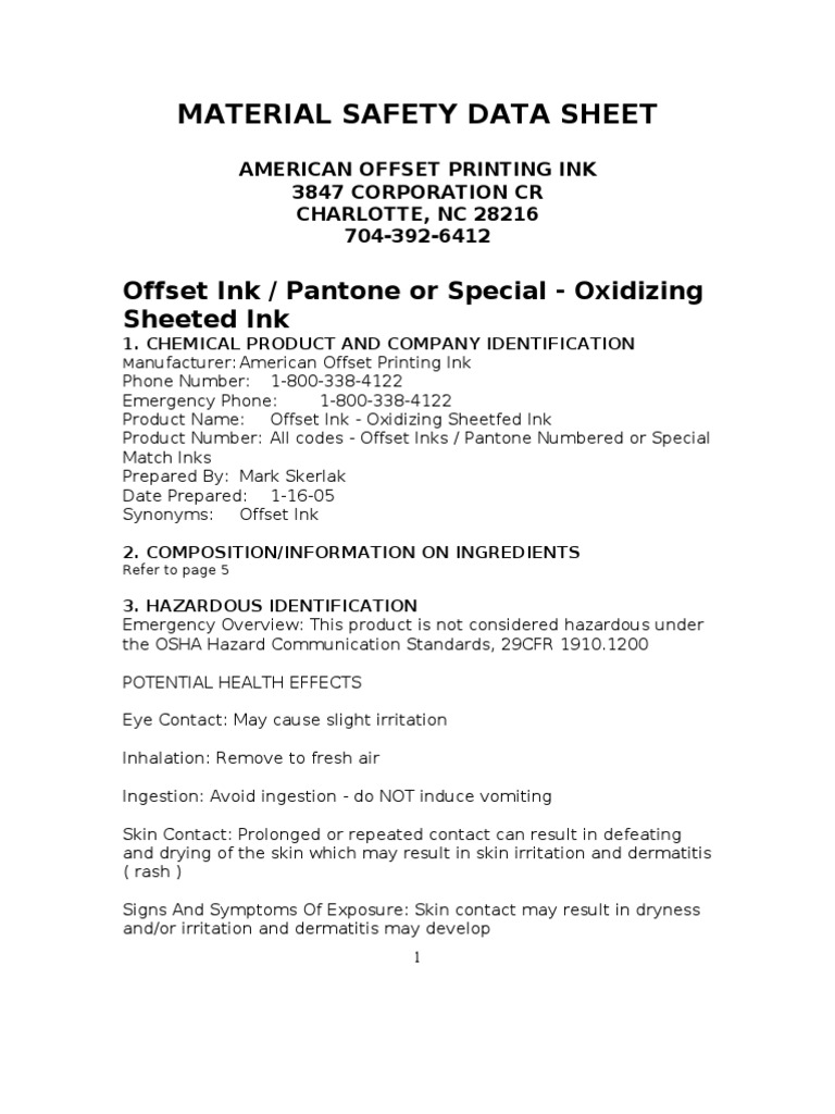 1. CHEMICAL PRODUCT AND COMPANY IDENTIFICATION Manufacturer: American Offset Printing Ink Phone Number: 1-800-338-4122 Emergency Phone: 1-800-338-4122 Product Name: Offset Ink - Oxidizing Sheetfed Ink Product Number: All codes - Offset Inks / Pantone Numbered or Special Match Inks Prepared By: Mark Skerlak Date Prepared: 1-16-05 Synonyms: Offset Ink 2. COMPOSITION/INFORMATION ON INGREDIENTS