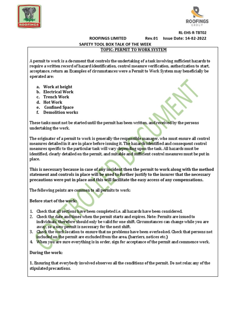 acceptance, return an Examples of circumstances were a Permit to Work System may beneficially be