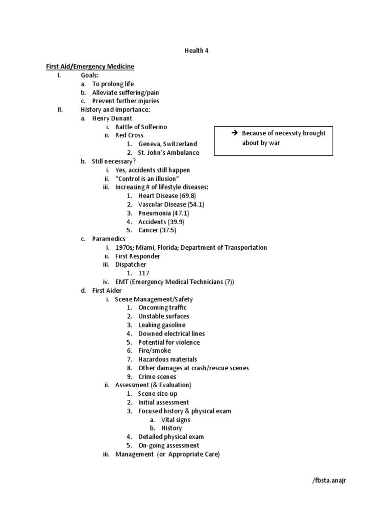 History and importance: a. Henry Dunant i. Battle of Solferino Because of necessity brought ii. Red Cross about by war 1. Geneva, Switzerland 2. St. Johns Ambulance b. Still necessary? i. Yes, accidents still happen ii. Control is an illusion iii. Increasing # of lifestyle diseases: 1. Heart Disease (69.8) 2. Vascular Disease (54.1) 3. Pneumonia (47.1) 4. Accidents (39.9) 5. Cancer (37.5) c. Paramedics i. 1970s; Miami, Florida; Department of Transportation ii. First Responder iii. Dispatcher 1. 117 iv. EMT (Emergency Medical Technicians (?)) d. First Aider i. Scene Management/Safety 1. Oncoming traffic 2. Unstable surfaces 3. Leaking gasoline 4. Downed electrical lines 5. Potential for violence 6. Fire/smoke 7. Hazardous materials 8. Other damages at crash/rescue scenes 9. Crime scenes ii. Assessment (& Evaluation) 1. Scene size-up 2. Initial assessment 3. Focused history & physical exam a. Vital signs b. History 4. Detailed physical exam 5. On-going assessment iii. Management (or Appropriate Care)