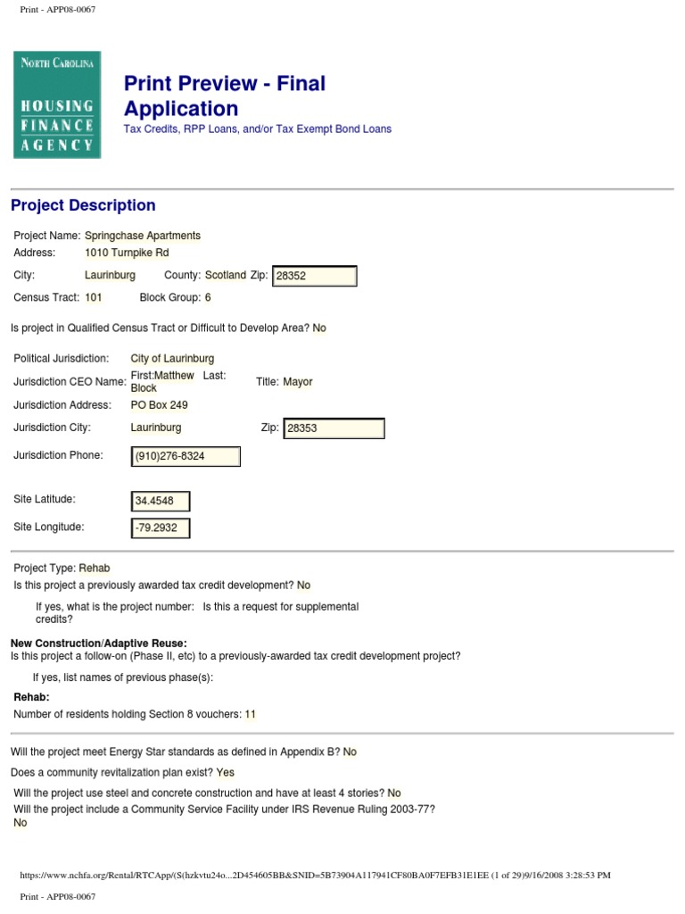Is project in Qualified Census Tract or Difficult to Develop Area? No Political Jurisdiction: Jurisdiction CEO Name: Jurisdiction Address: Jurisdiction City: Jurisdiction Phone: City of Laurinburg First:Matthew Last: Block PO Box 249 Laurinburg Zip: 28353 Title: Mayor
