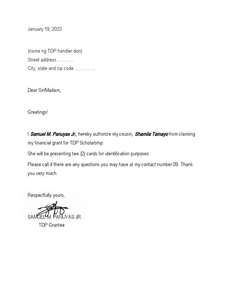 I Samuel M. Panuyas Jr., hereby authorize my cousin, Shamila Tamayo from claiming