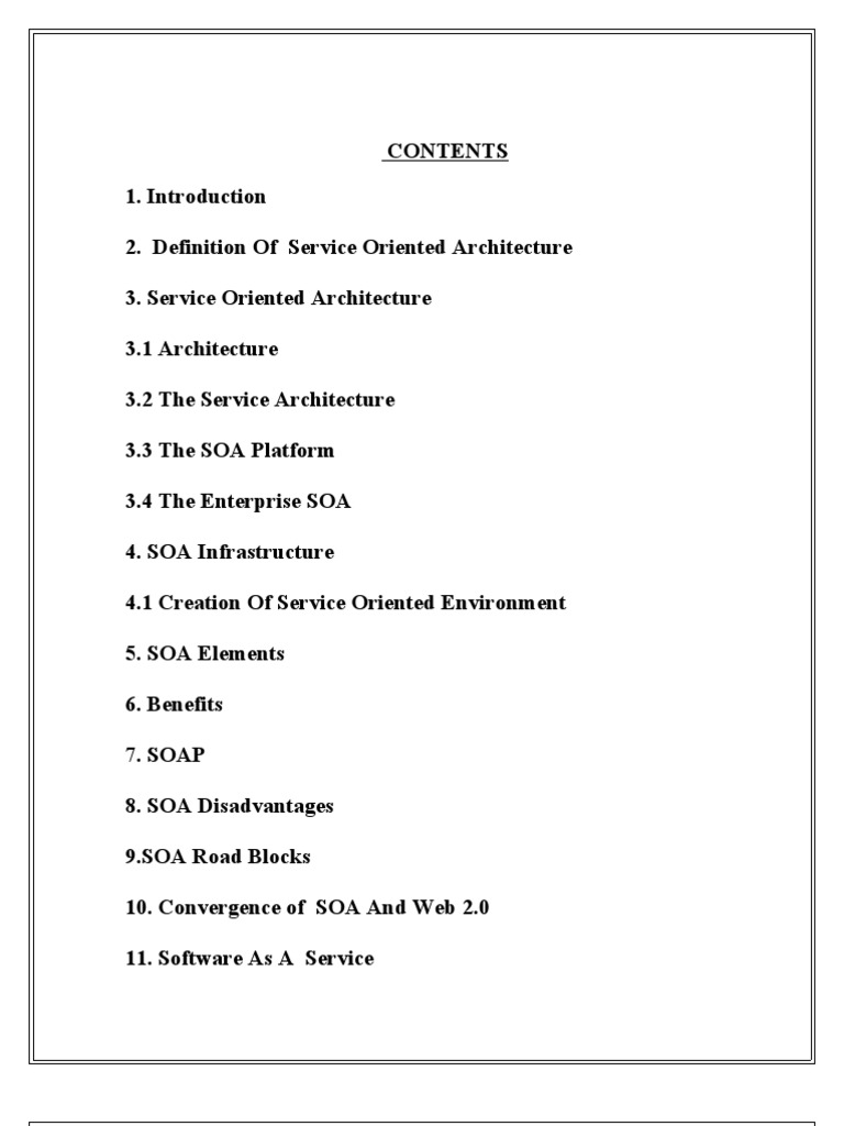 2 The Service Architecture 3.3 The SOA Platform 3.4 The Enterprise SOA 4. SOA Infrastructure 4.1 Creation Of Service Oriented Environment 5. SOA Elements 6. Benefits 7. SOAP 8. SOA Disadvantages [Link] Road Blocks 10. Convergence of SOA And Web 2.0 11. Software As A Service