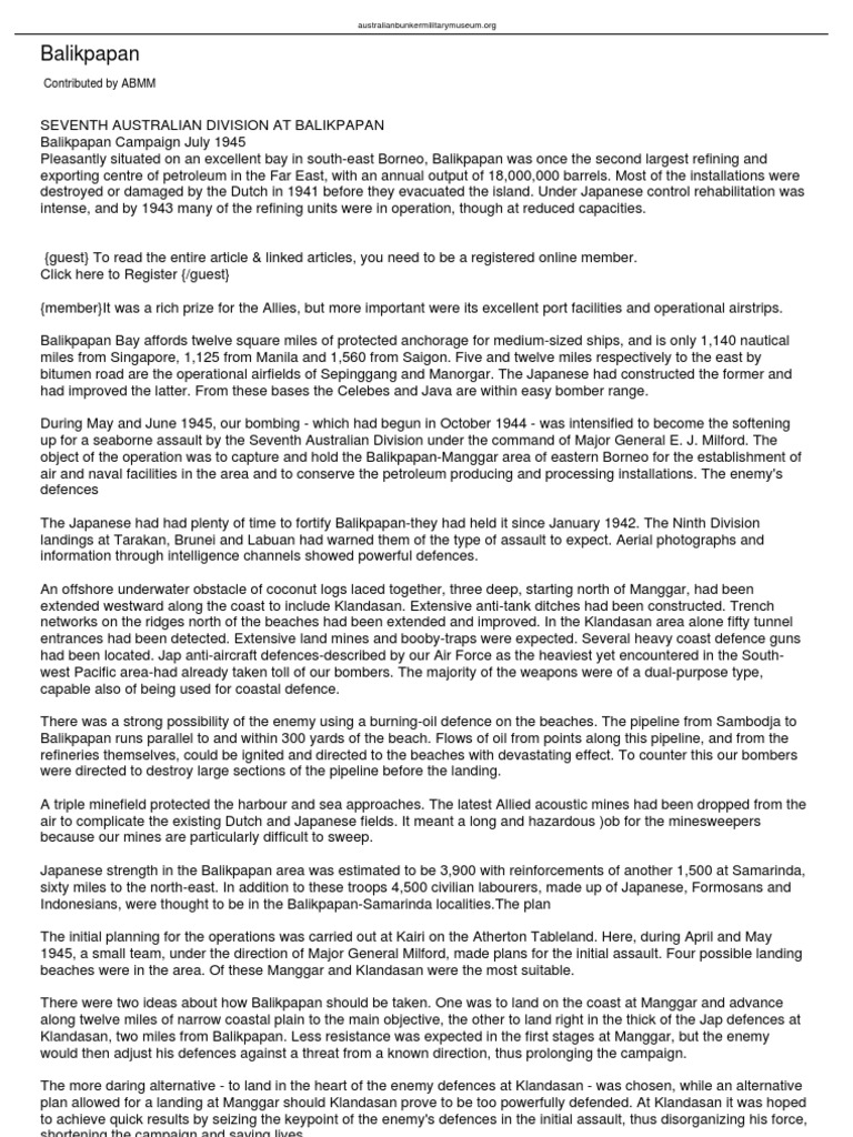 {guest} To read the entire article & linked articles, you need to be a registered online member. Click here to Register {/guest} {member}It was a rich prize for the Allies, but more important were its excellent port facilities and operational airstrips. Balikpapan Bay affords twelve square miles of protected anchorage for medium-sized ships, and is only 1,140 nautical miles from Singapore, 1,125 from Manila and 1,560 from Saigon. Five and twelve miles respectively to the east by bitumen road are the operational airfields of Sepinggang and Manorgar. The Japanese had constructed the former and had improved the latter. From these bases the Celebes and Java are within easy bomber range. During May and June 1945, our bombing - which had begun in October 1944 - was intensified to become the softening up for a seaborne assault by the Seventh Australian Division under the command of Major General E. J. Milford. The object of the operation was to capture and hold the Balikpapan-Manggar area of eastern Borneo for the establishment of air and naval facilities in the area and to conserve the petroleum producing and processing installations. The enemy's defences The Japanese had had plenty of time to fortify Balikpapan-they had held it since January 1942. The Ninth Division landings at Tarakan, Brunei and Labuan had warned them of the type of assault to expect. Aerial photographs and information through intelligence channels showed powerful defences. An offshore underwater obstacle of coconut logs laced together, three deep, starting north of Manggar, had been extended westward along the coast to include Klandasan. Extensive anti-tank ditches had been constructed. Trench networks on the ridges north of the beaches had been extended and improved. In the Klandasan area alone fifty tunnel entrances had been detected. Extensive land mines and booby-traps were expected. Several heavy coast defence guns had been located. Jap anti-aircraft defences-described by our Air Force as the heaviest yet encountered in the Southwest Pacific area-had already taken toll of our bombers. The majority of the weapons were of a dual-purpose type, capable also of being used for coastal defence. There was a strong possibility of the enemy using a burning-oil defence on the beaches. The pipeline from Sambodja to Balikpapan runs parallel to and within 300 yards of the beach. Flows of oil from points along this pipeline, and from the refineries themselves, could be ignited and directed to the beaches with devastating effect. To counter this our bombers were directed to destroy large sections of the pipeline before the landing. A triple minefield protected the harbour and sea approaches. The latest Allied acoustic mines had been dropped from the air to complicate the existing Dutch and Japanese fields. It meant a long and hazardous )ob for the minesweepers because our mines are particularly difficult to sweep. Japanese strength in the Balikpapan area was estimated to be 3,900 with reinforcements of another 1,500 at Samarinda, sixty miles to the north-east. In addition to these troops 4,500 civilian labourers, made up of Japanese, Formosans and Indonesians, were thought to be in the Balikpapan-Samarinda [Link] plan The initial planning for the operations was carried out at Kairi on the Atherton Tableland. Here, during April and May 1945, a small team, under the direction of Major General Milford, made plans for the initial assault. Four possible landing beaches were in the area. Of these Manggar and Klandasan were the most suitable. There were two ideas about how Balikpapan should be taken. One was to land on the coast at Manggar and advance along twelve miles of narrow coastal plain to the main objective, the other to land right in the thick of the Jap defences at Klandasan, two miles from Balikpapan. Less resistance was expected in the first stages at Manggar, but the enemy would then adjust his defences against a threat from a known direction, thus prolonging the campaign. The more daring alternative - to land in the heart of the enemy defences at Klandasan - was chosen, while an alternative plan allowed for a landing at Manggar should Klandasan prove to be too powerfully defended. At Klandasan it was hoped to achieve quick results by seizing the keypoint of the enemy's defences in the initial assault, thus disorganizing his force, shortening the campaign and saving lives.