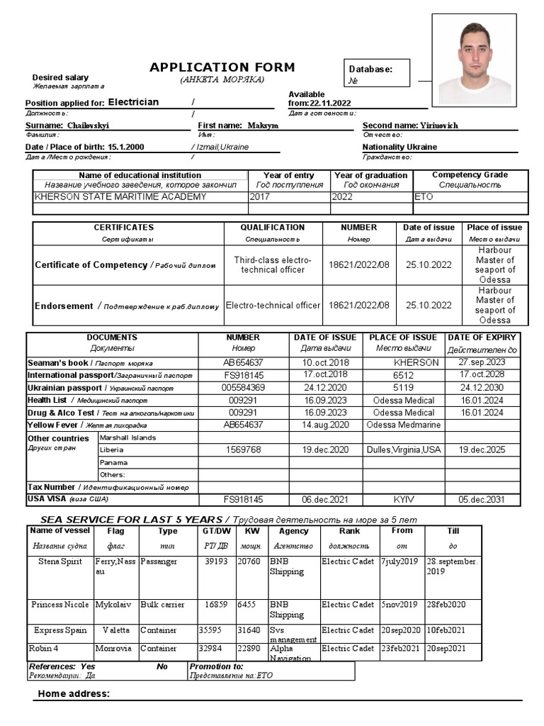 Seaman’s book / Паспорт моряка AB 654637 10.oct.2018 KHERSON 27.sep.2023