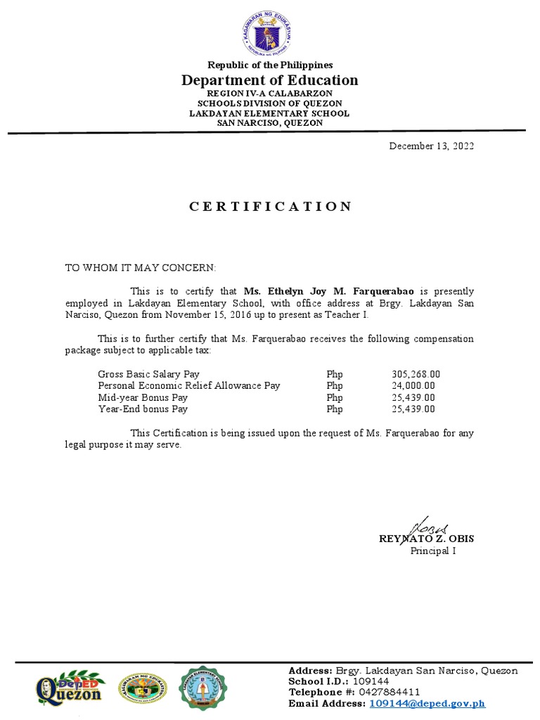 This is to further certify that Ms. Farquerabao receives the following compensation