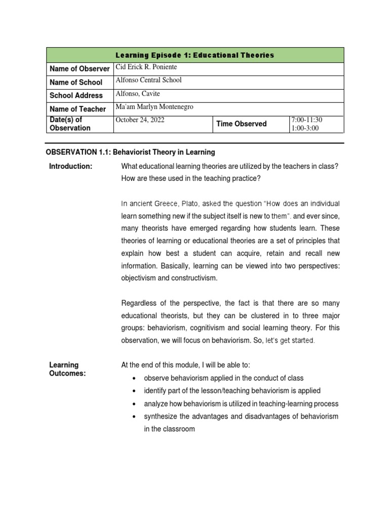 OBSERVATION 1.1: Behaviorist Theory in Learning
